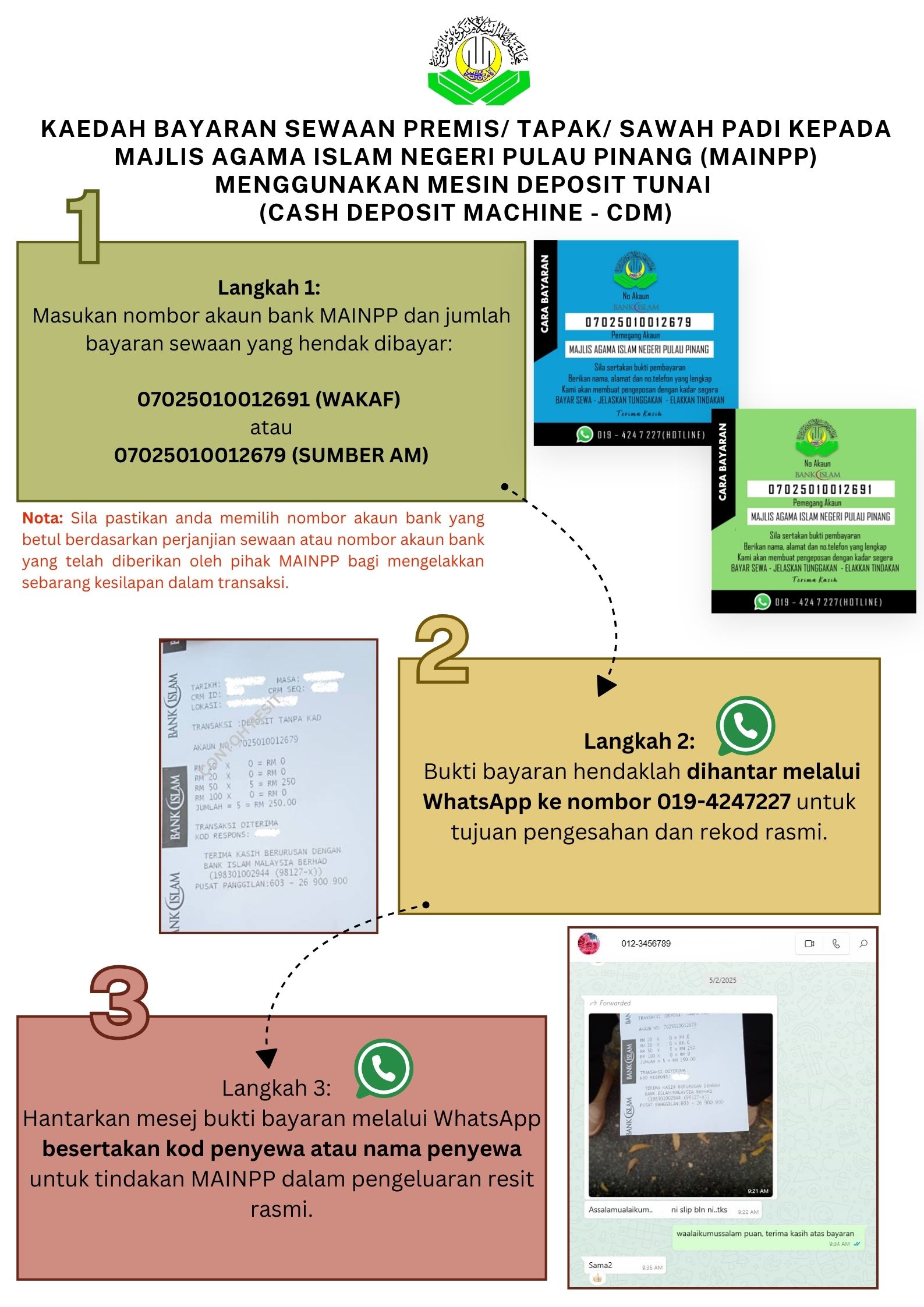 Kaedah Bayaran Sewaan Premis/ Tapak/ Sawah Padi Kepada Majlis Agama Islam Negeri Pulau Pinang (MAINPP) Menggunakan Mesin Deposit Tunai (Cash Deposit Machine - CDM)